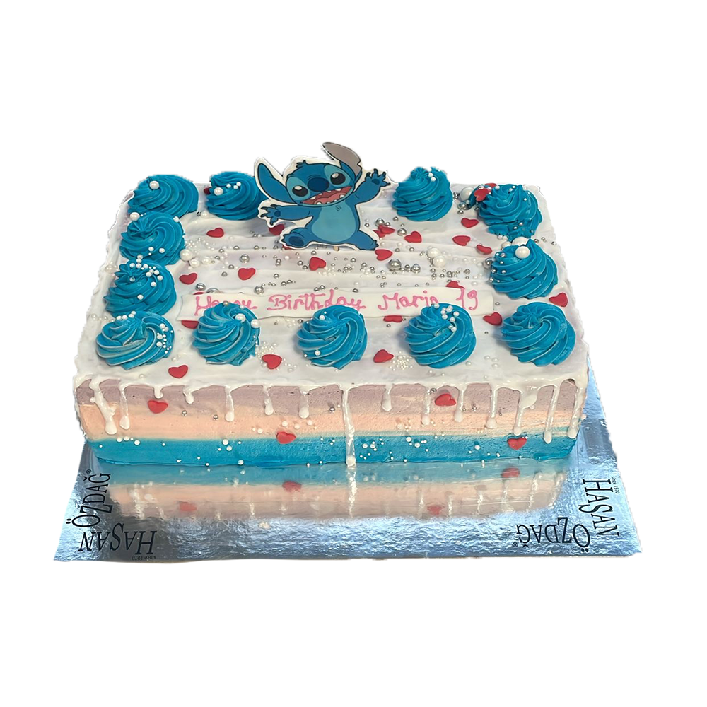 Unsere Stitch-Traum Torte ist die ideale Wahl für Kindergeburtstage! Mit liebevollen Details wie einer Stitch-Figur, blauen Buttercreme-Rosetten und kleinen Herz-Dekorationen bringt diese rechteckige Torte Freude und Magie auf jede Feier. Ein absolutes Highlight, das nicht nur optisch begeistert, sondern auch himmlisch schmeckt.